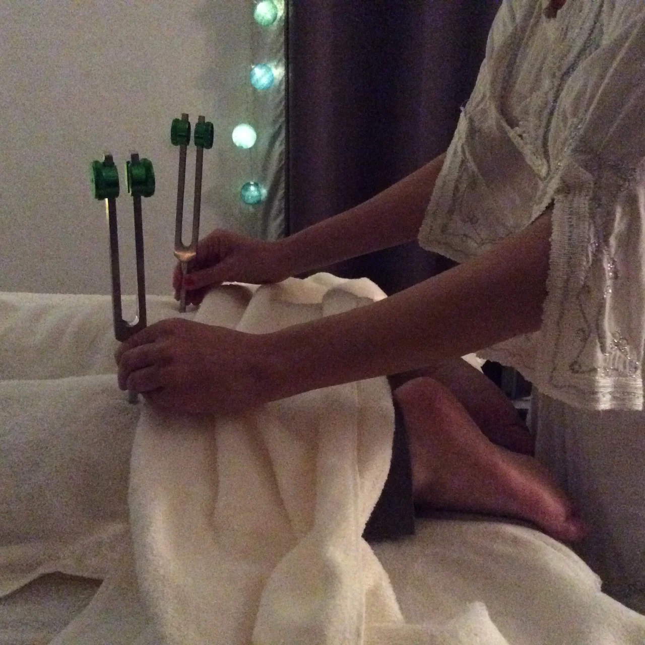 Diapasons et senteurs. Allongé. Sur l’avant du corps. Favorise le lâcher prise, relaxe, détente ressentie. (Protocole créé par Emmanuel Comte : institut Medson)